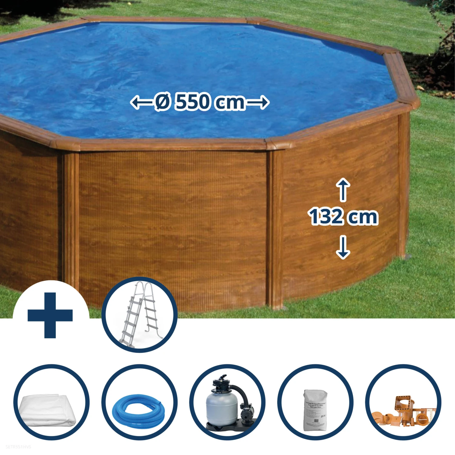Dieser Rundformpool hat die Maße 550 x 132 cm und die Außenfarbe Holzoptik.