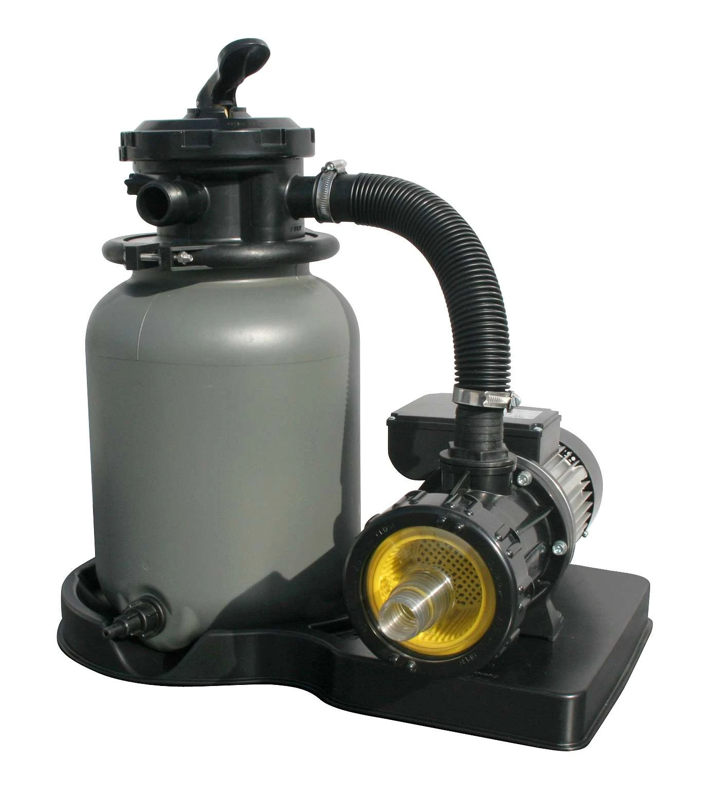- 6-Wege-Ventil mit 38 mm Anschlüßen (Funktionen: Filtern, Rückspülen, Nachspülen, Entleeren, Zirkulieren, Geschlossen)