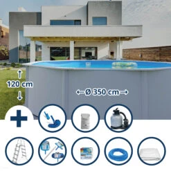 Dieser Rundformpool hat die Maße 350 x 120 cm und die Außenfarbe weiß.