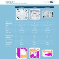 Unsere Planet-Spa Outdoor Whirlpools werden unter höchsten Qualitätsstandards mit hochwertigen Bauteilen gefertigt. Sie können freistehend oder im Boden versenkt platziert werden.